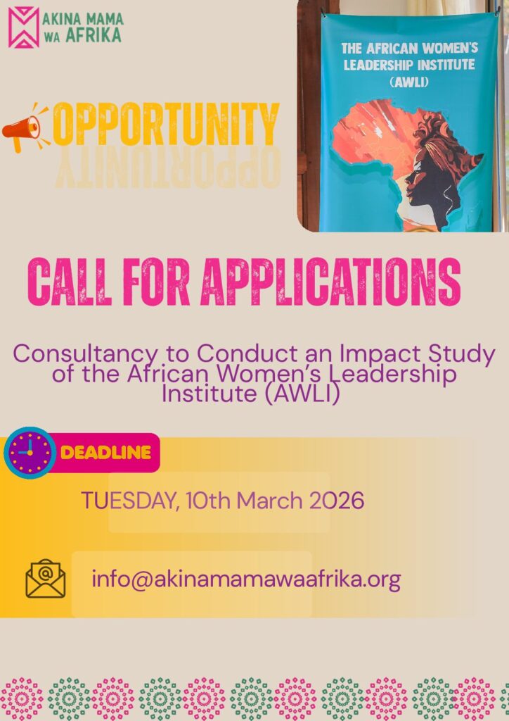 Akina Mama wa Afrika (AMwA) is seeking an experienced feminist researcher or consultancy team to conduct an Impact study on the African Women’s Leadership Institute (AWLI). The study will critically analyse AWLI’s impact, legacy, effectiveness, and broader implications for social transformation in Africa. What We’re Looking For: We seek a professional consultant with a strong track […]